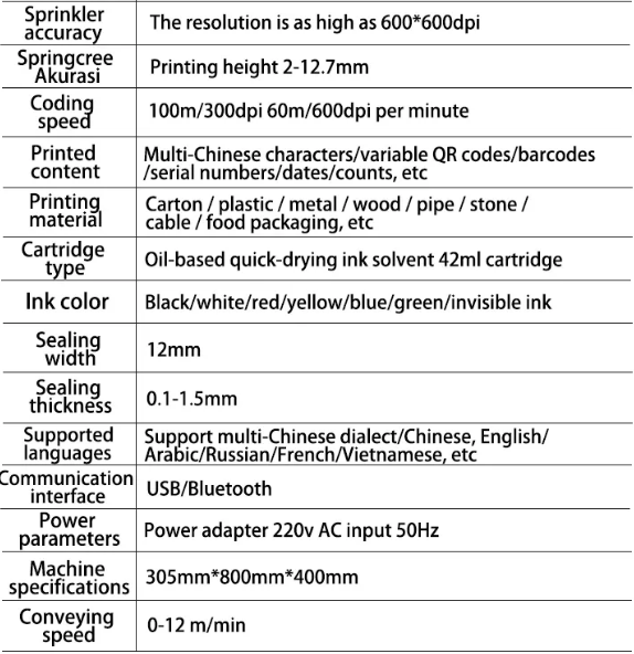 The resolution is as high as 600*600dpi Sealing width 12mm Sealing thickness 0.1-1.5mm Communicationinterface USB/Bluetooth Powerparameters Power adapter 220v AC input 50Hz.